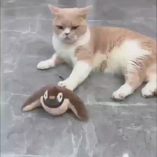 El juguete se activa con un mecanismo de cuerda (manual) que le da un movimiento realista en el aire, imitando el vuelo de un pájaro para estimular el instinto cazador del gato.